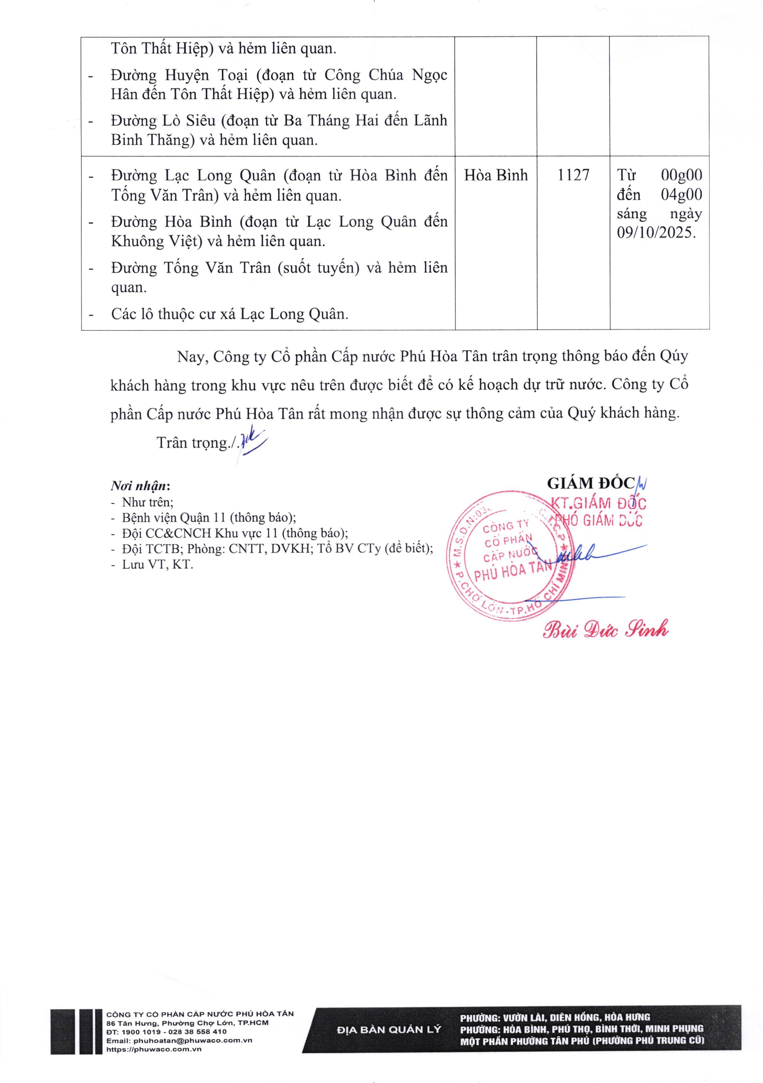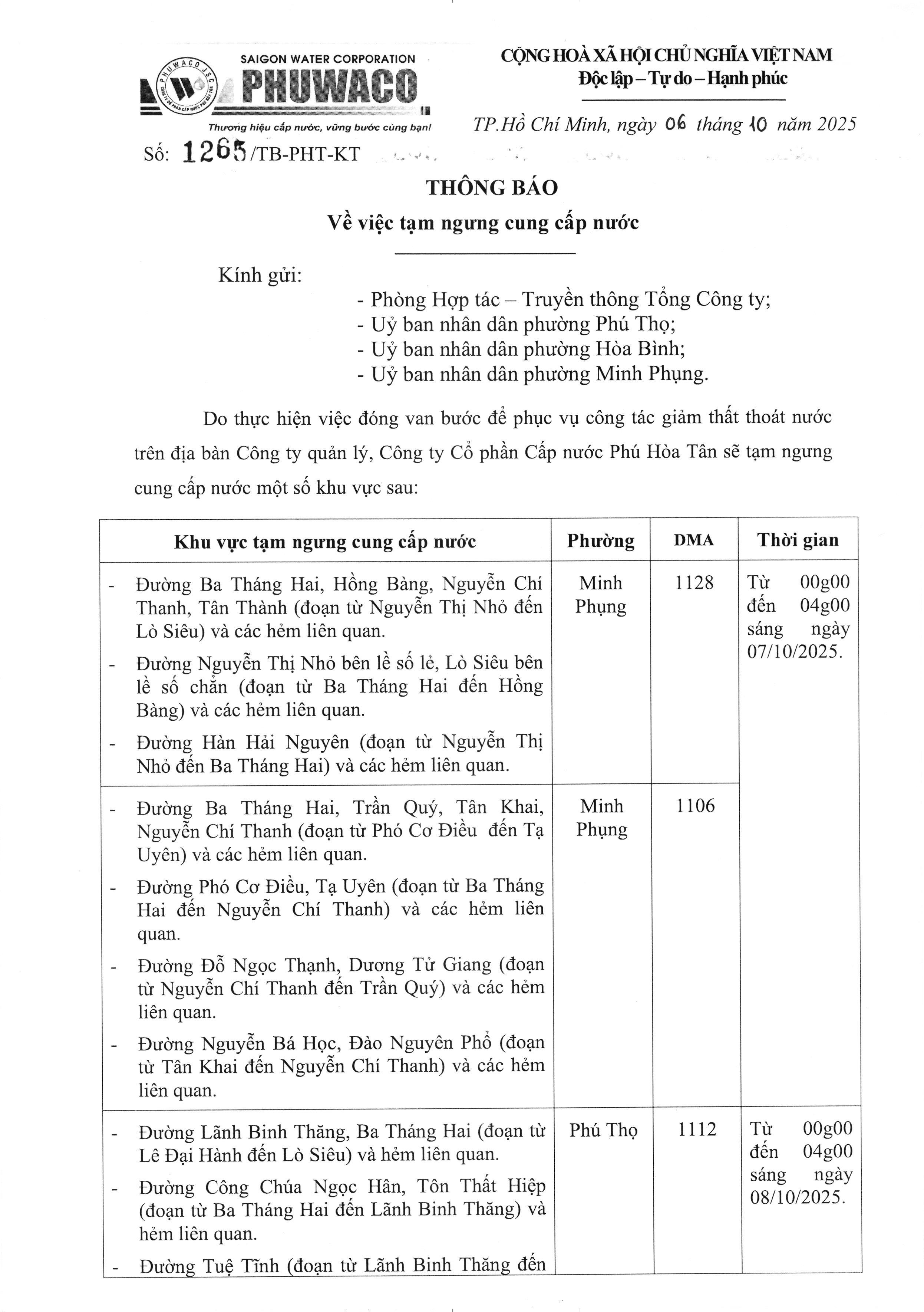 Thông báo tạm ngưng cung cấp nước phường Phú Thọ, Hòa Bình, Minh Phụng