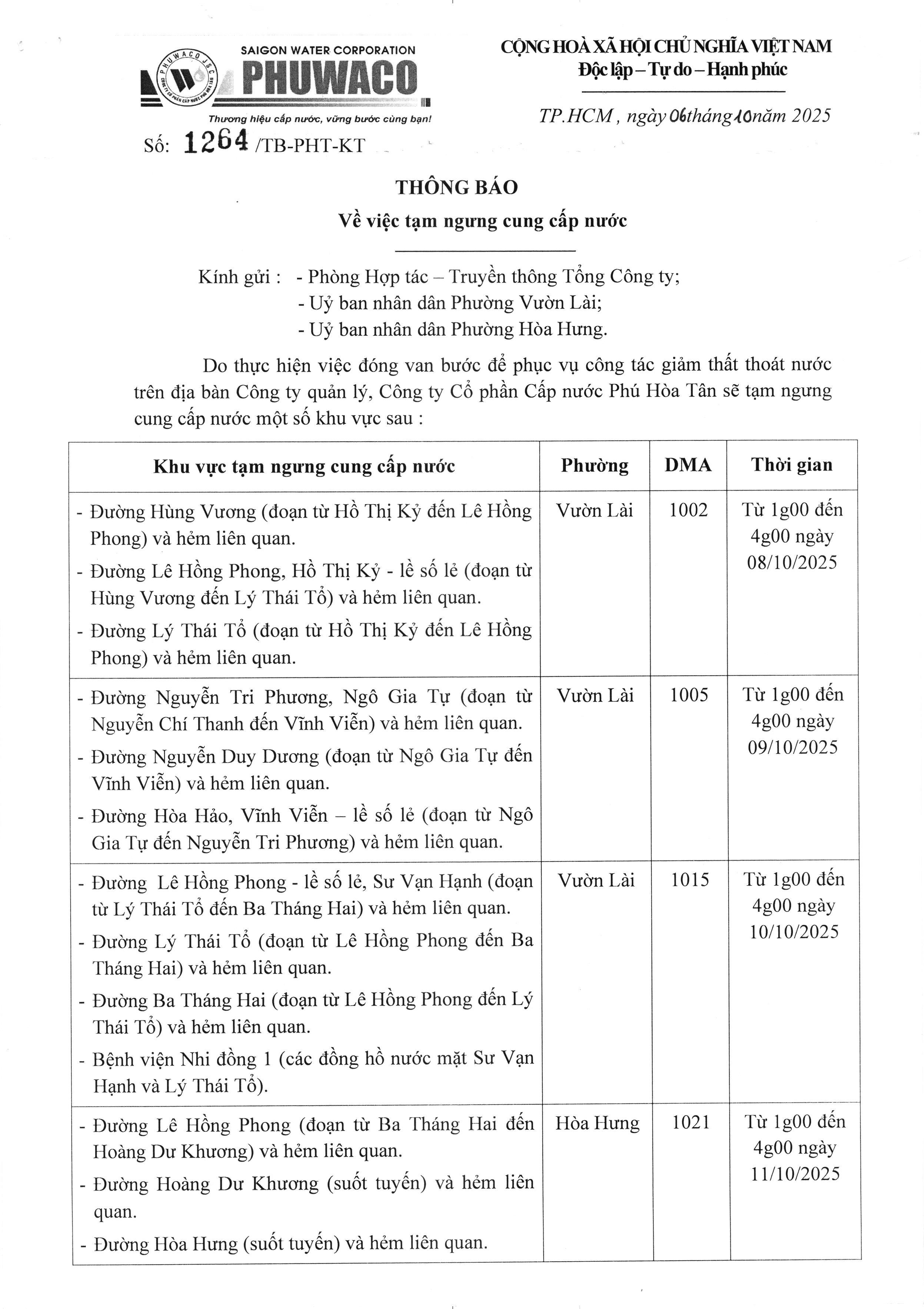 Thông báo tạm ngưng cung cấp nước phường Vườn Lài, Hòa Hưng