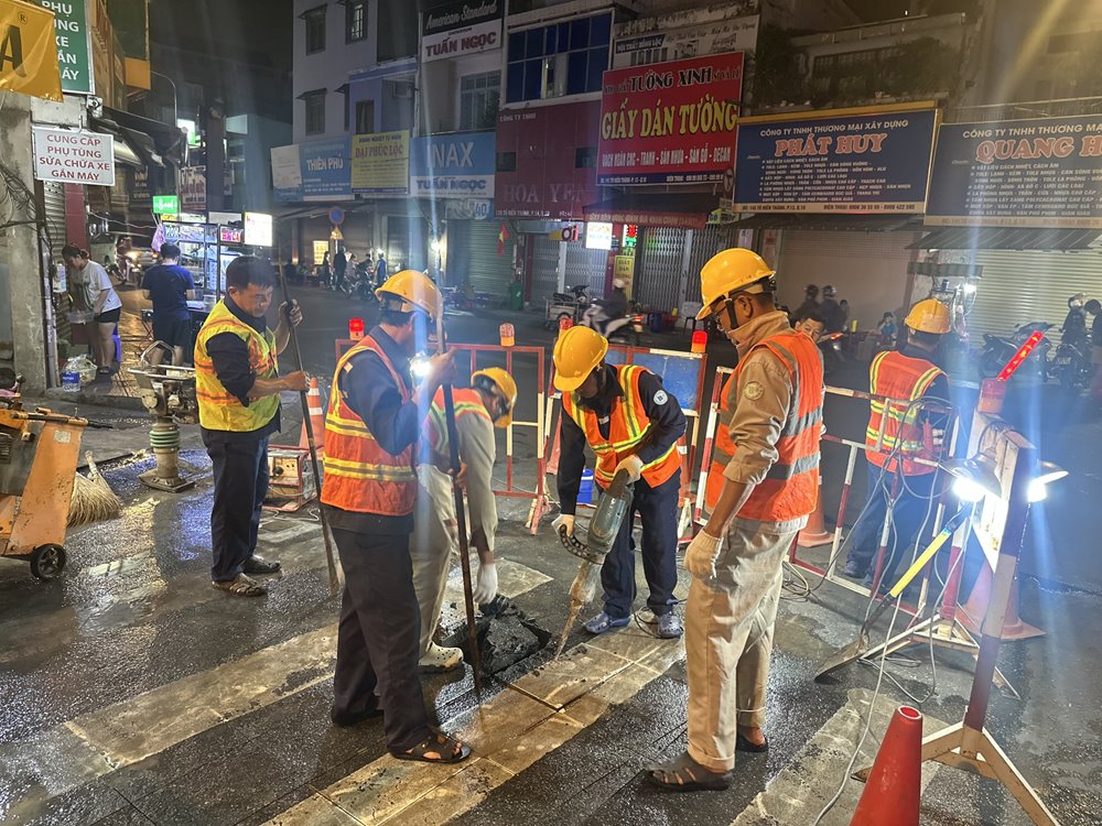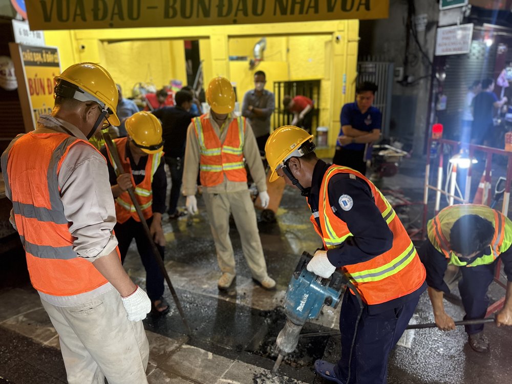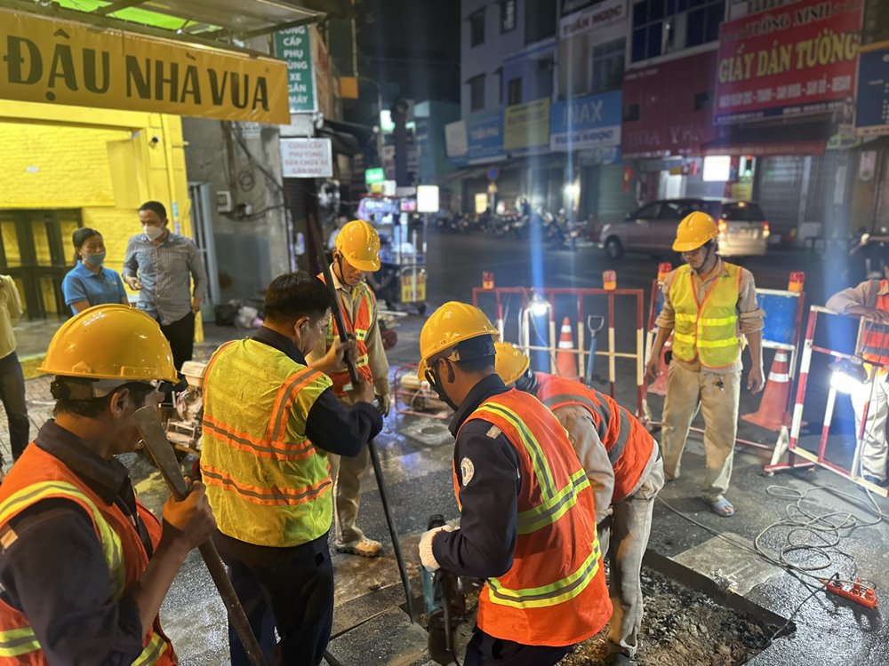 Điểm gắn van nằm trên tuyến có kích thước lớn nên công tác đào đường thi công gặp nhiều khó khăn, nhưng các anh công nhân sửa bể đêm vẫn cố gắng xác định đúng các vị trí tuyến trên để gắn van chặn tuyến nhằm hạn chế thấp nhất lượng nước thất thoát. Càng về đêm, công việc càng được thực hiện nhanh và hiệu quả hơn vì các phương tiện giao thông giảm, đường xá thông thoáng và bớt tiếng ồn.