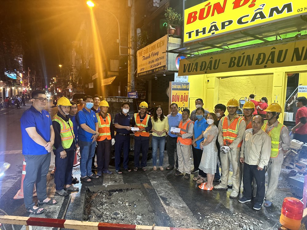 Nhằm thể hiện sự quan tâm, chăm lo cho lực lượng công nhân thi công vào ban đêm, vào lúc 22h ngày 05/05/2023, Ban giám đốc, Công đoàn - Đoàn thanh niên Công ty Cổ phần Cấp nước Phú Hòa Tân tổ chức thăm hỏi và tặng quà cho các công nhân thi công gắn van chặn tuyến Ø300 tại giao lộ Tô Hiến Thành và Hồ Bá Kiện P15, Q10.