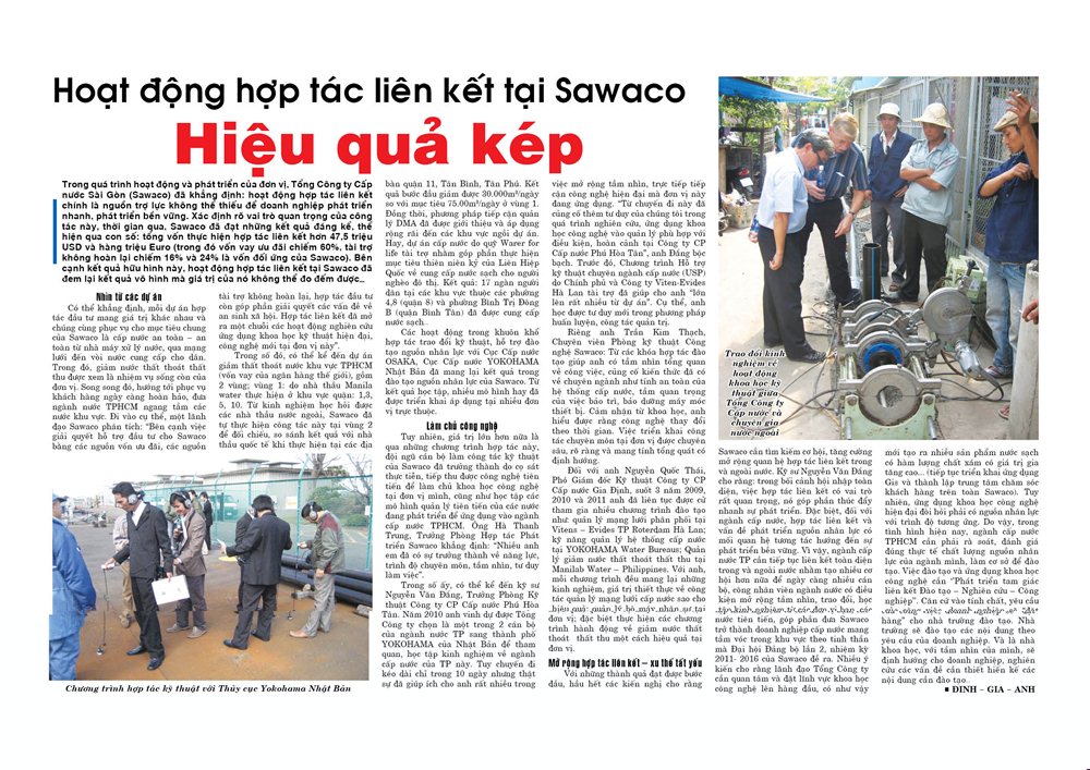 Trong quá trình hoạt động và phát triển của đơn vị Tổng Công ty Cấp nước Sài Gòn (Sawaco) đã khẳng định quá trình hợp tác liên kết chính là nguồn trợ lực không thể thiếu để doanh nghiệp phát triển nhanh, phát triển bền vững. Xác định rõ vai trò quan trọng của công tác này, thời gian qua, Sawaco đã đạt được những kết quả đáng kể, thể hiện qua con số: tổng vốn thực hiện hợp tác liên kết hơn 47.5 triệu USD và hàng triệu Euro (trong đó vốn vay ưu đãi chiếm 60%, tài trợ không hoàn lại chiếm 16% và 24% là vốn đối ứng của Sawaco). Bên cạnh kết quả hữu hình này, hoạt động hợp tác liên kết tại Sawaco đã đem lại kết quả vô hình mà giá trị của nó không thể đo đếm được...
