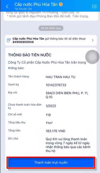 Nhấn “Thanh toán trực truyến” khi nhận báo cước qua Zalo.
