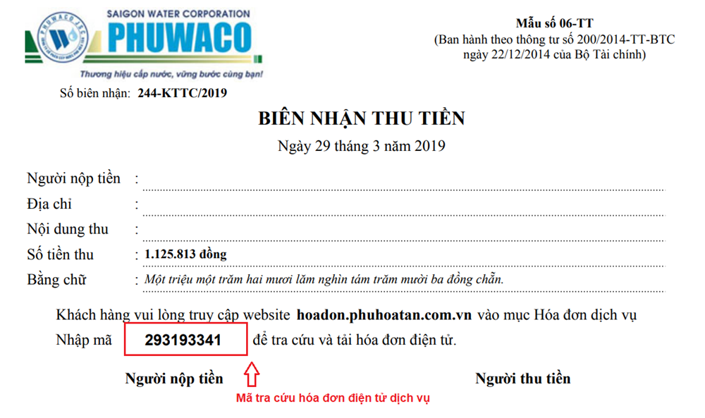 Khi thu tiền, Công ty sẽ cấp Biên nhận thu tiền để xác nhận Quý khách hàng đã thanh toán dịch vụ, trên biên nhận hiển thị mã tra cứu để Quý khách hàng có thể tra cứu và tải hóa đơn điện tử