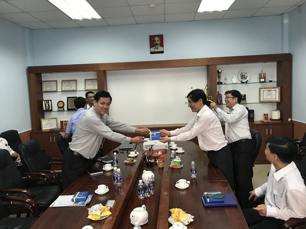 Kết thúc buổi trao đổi, Ông Phạm Khương Thảo – Giám đốc Công ty Cổ phần Cấp nước Phú Hòa Tân tặng quà lưu niệm cho đoàn Cấp nước Thừa Thiên Huế thay cho lời cảm ơn.
