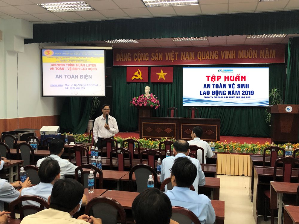 Nhằm tuân thủ các quy định pháp luật, đồng thời trang bị kiến thức chung về An toàn lao động và sơ cấp cứu cho cán bộ công nhân viên trong Công ty. Ngày 21,25/05/2019 Công ty Cổ phần Cấp nước Phú Hòa Tân phối hợp với Công ty TNHH huấn luyện an toàn khu vực phía Nam tổ chức khoá tập huấn công tác an toàn vệ sinh lao động năm 2018 cho hơn 100 CB.CNV của các phòng ban đội chức năng tại Công ty.