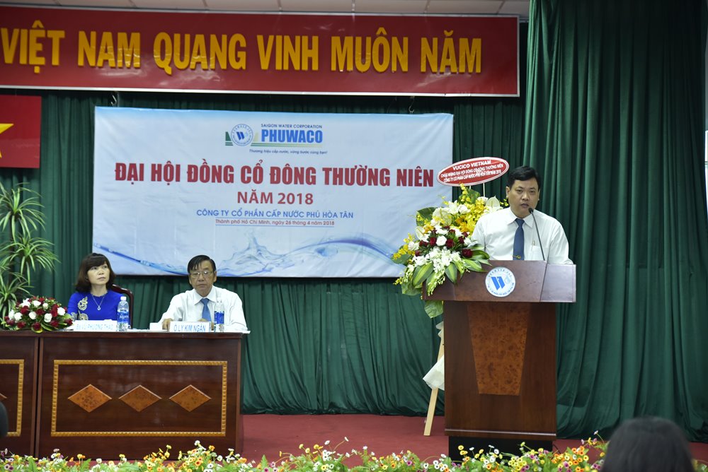 Ngày 26/4/2018, tại trụ sở Công ty số 86 Tân Hưng, Phường 12, Quận 5, Tp.HCM, Đại hội đồng cổ đông thường niên năm 2018 – Công ty CP Cấp nước Phú Hòa Tân (Phuwaco) đã diễn ra thành công tốt đẹp với sự tham dự của 104 cổ đông, đại diện 7.392.545 cổ phần đạt tỉ lệ 82,14% tổng số cổ phần. Cùng tham dự có Ông Dương Hồng Đệ – Phó Bí thư thường trực Đảng ủy Tổng Công ty Cấp nước TNHH MTV; Bà Phạm Minh Hồng - Trưởng Ban Kiểm soát Tổng Công ty Cấp nước Sài Gòn TNHH MTV; Hội đồng Quản trị; Ban Kiểm soát và Ban Điều hành Phuwaco.