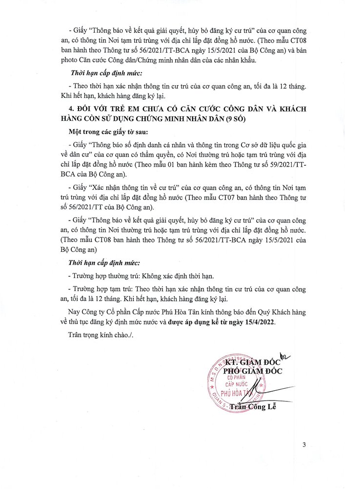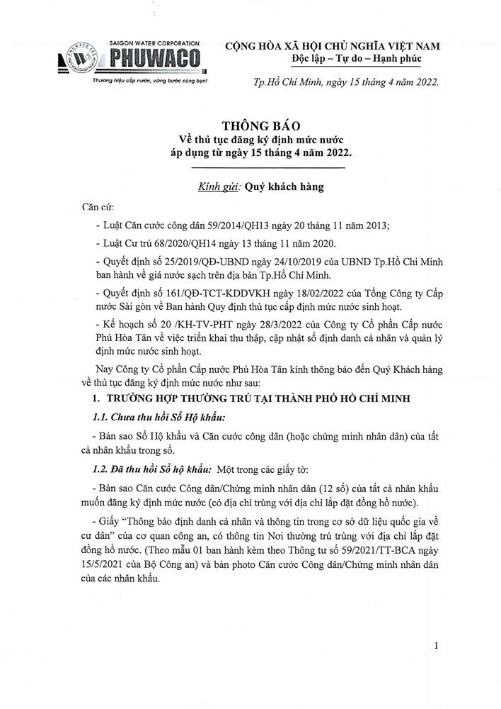 Công ty kính thông báo đến Quý khách hàng về thủ tục đăng ký định mức nước áp dụng từ ngày 15 tháng 4 năm 2022