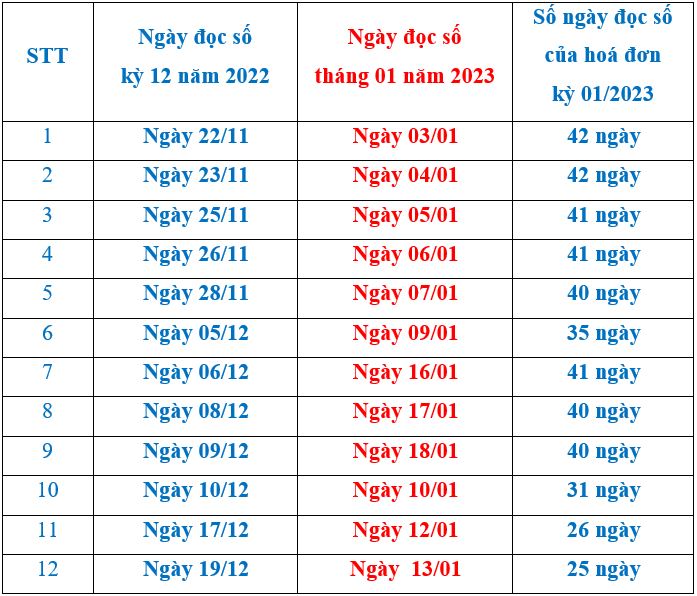 Về việc điều chỉnh lịch đọc chỉ số kể từ tháng 01/2023