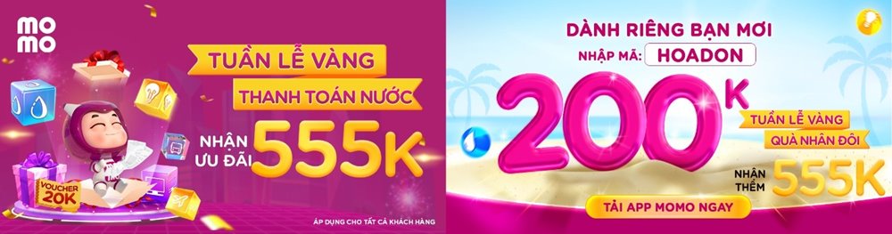 Thanh toán hoá đơn Nước qua MoMo siêu nhanh, lại được nhận ngay gói quà khủng! Quét kỳ cước cực mượt chỉ với một vài cú chạm trên ứng dụng MoMo, dễ dàng thực hiện ở bất cứ đâu. Đặc biệt, trong thời gian này khi mở MoMo thanh toán hóa đơn Nước trên 30.000đ, bạn có 100% cơ hội nhận ngay bộ thẻ quà trị giá 555.000đ.