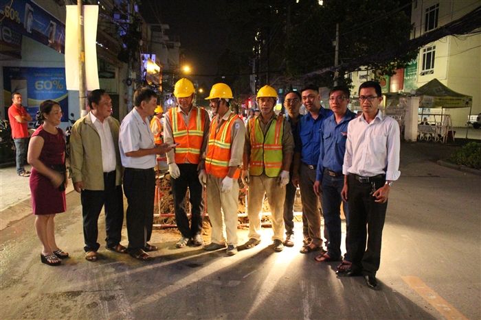 Nhân kỷ niệm 35 năm ngày truyền thống thanh niên công nhân thành phố (15/10/1982 - 15/10/2017) Công đoàn, Đoàn thanh niên Công ty Cổ phần Cấp nước Phú Hòa Tân đã tổ chức thăm anh em công nhân làm đêm đang thực hiện công tác lắp van chặn tuyến ống D300 tại giao lộ Tô Hiến Thành - Sư Vạn Hạnh.