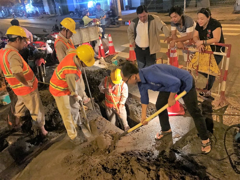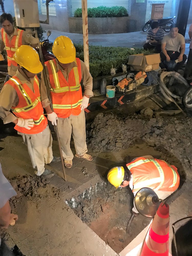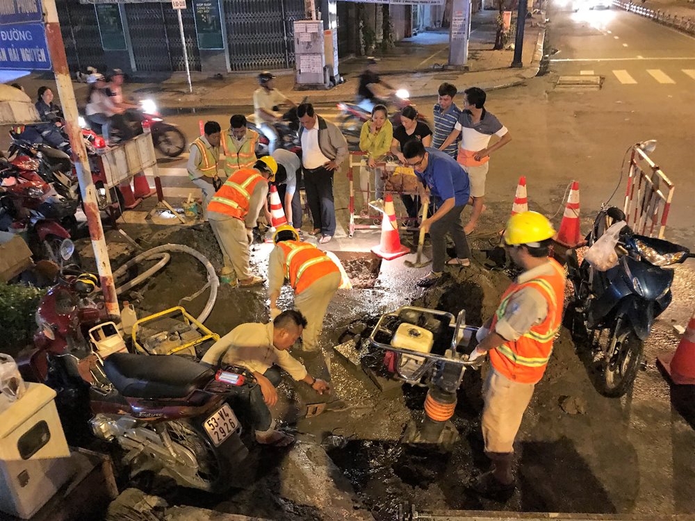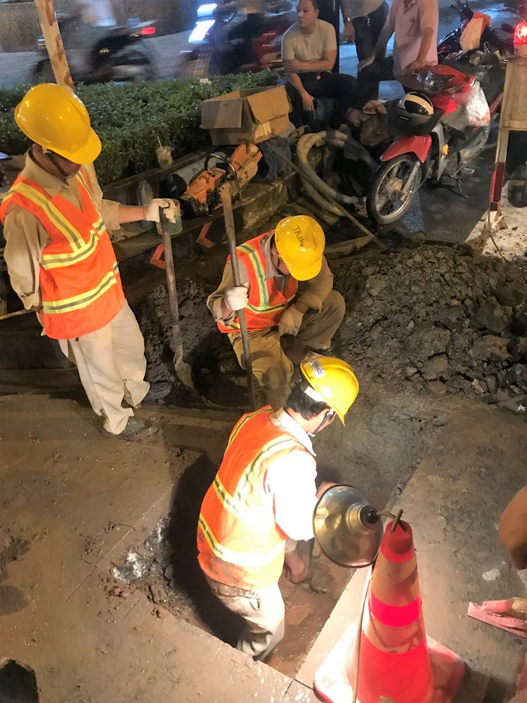 Trong thời tiết đang vào mùa mưa, điểm bể lại nằm trên ống có kích thước lớn nên công tác đào đường thi công gặp nhiều khó khăn, nhưng các anh công nhân sửa bể đêm vẫn cố gắng xác định đúng các vị trí bể trên để sửa chữa, khắc phục kịp thời nhằm hạn chế thấp nhất lượng nước thất thoát. Càng về đêm, công việc càng được thực hiện nhanh và hiệu quả hơn vì các phương tiện giao thông giảm, đường xá thông thoáng và bớt tiếng ồn.